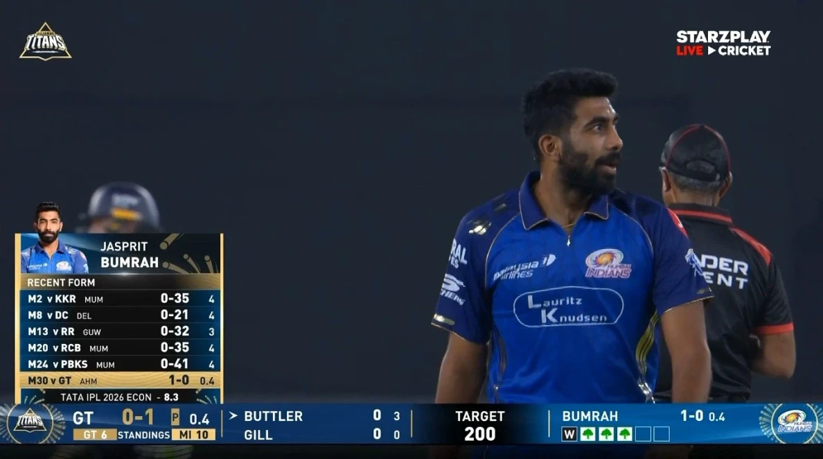 Jasprit Bumrah achieved his first wicket of the season through his best execution of the bowling technique. He got Sai Sudharsan out on his first delivery during the Gujarat Titans innings. The bowler who normally performs at high standards for his position experienced an unusual five-game period without achieving any wickets. The delivery was full and moved away slightly. Sai Sudharsan attempted to hit a shot over the covers, but he failed to move his feet. Krish Bhagat made an easy catch at cover-point after the batter hit a thick edge. The play created an important situation at the beginning of the contest. The early wicket helped Mumbai Indians establish their match control. The Gujarat Titans found themselves in immediate trouble after Sudharsan, their top batsman, went out for a score of zero. Watch video here: Guess who’s back? 🔥#JaspritBumrah makes a statement with his first wicket of the season, putting #MI on 🔝#TATAIPL 2026 | #GTvMI | LIVE NOW 👉 https://t.co/EXwHuATomY pic.twitter.com/eQJ9QHheuX — Star Sports (@StarSportsIndia) April 20, 2026 Also Read | Why Prasidh Krishna is so Effective in Middle Overs in IPL 2026 Why this wicket is very important This season, Sai Sudharsan has shown himself as a reliable batsman who delivers consistent performances. The team achieved significant success because they managed to dismiss him from the game. The bowler needed this wicket to boost his confidence after experiencing difficulties during the early season. Through his record against Sudharsan, he has proven his ability to achieve victories against him. Sai Sudarshan vs Bumrah in IPL Innings Runs Balls Outs 3 17 18 2 Bumrah has consistently managed to create difficulties for him. Wickets which occur during the first over have the potential to alter the entire match outcome. The Gujarat Titans faced increased difficulty when their essential batsman fell ill during their pursuit of a substantial target. Early pressure on Gujarat Titans Gujarat Titans lost their second wicket to Hardik Pandya when Jos Buttler got out lbw after the first wicket. The team fell to 19 with 2 wickets lost after 2 overs of play. The team requires a major partnership despite Washington Sundar scoring 12 runs from 4 balls after he played multiple fast shots. Shubman Gill remains at the creas and he must assume an essential position now. The Mumbai Indians bowlers have begun their match with strong performance through Bumrah's opening wicket. Match Scenario Mumbai Indians achieved a total of 199 runs while losing 5 wickets during their 20 overs. The major performer of the match scored 101 runs without getting out from 45 balls. Naman Dhir contributed 45 runs, while Suryakumar Yadav and Hardik Pandya together scored fewer runs. Gujarat Titans lost 3 wickets to Kagiso Rabada, while Mohammed Siraj and Prasidh Krishna each took 1 wicket. Gujarat Titans have scored 19 runs at the cost of 2 wickets after completing 2 overs of their 200 run chase. Sai Sudharsan got out on the first ball to Jasprit Bumrah. Jos Buttler scored 5 runs but was out lbw to Hardik Pandya. Shubman Gill has not yet scored, while Washington Sundar is making progress with 12 runs from 4 balls. The Mumbai Indians bowlers have started their performance with excellent results.